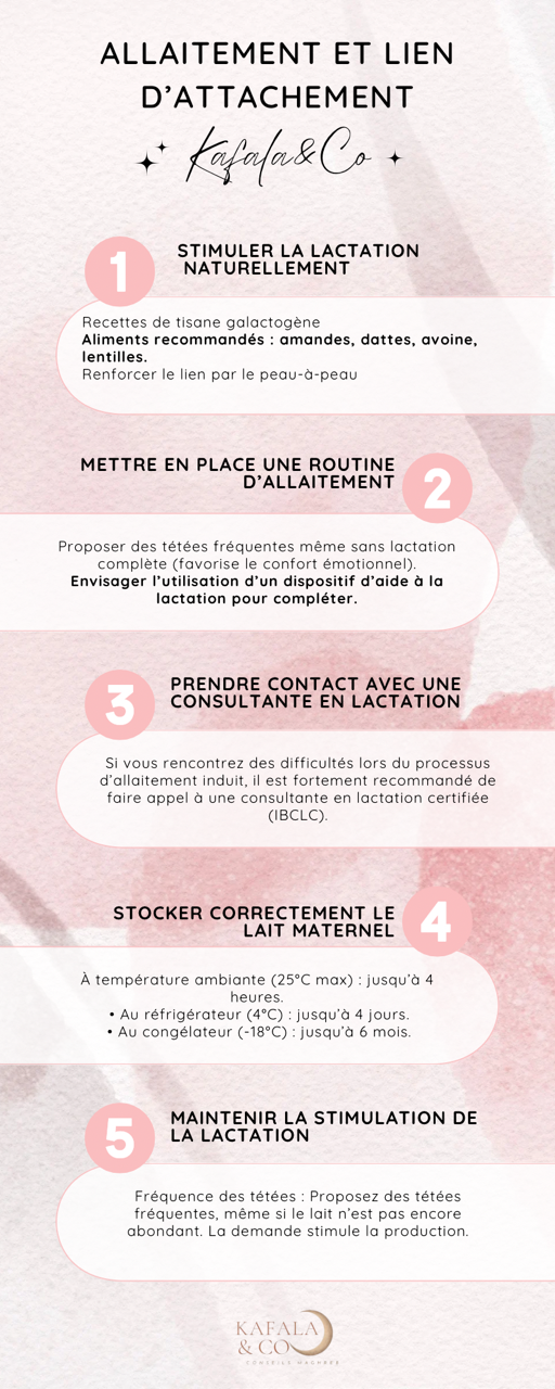 La lactation induite est le processus par lequel une femme stimule la production de lait maternel sans avoir été enceinte, afin d’allaiter un enfant qu’elle n’a pas porté. Cette pratique peut renforcer le lien affectif entre la mère et l’enfant dans le cadre d’une kafala.